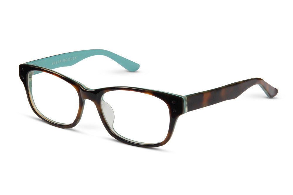 A gloss tortoise-shell front is contrasted on the inside by a powder blue interior. Medium sized and rectangular with rounded corners. A lighter acetate frame than most.